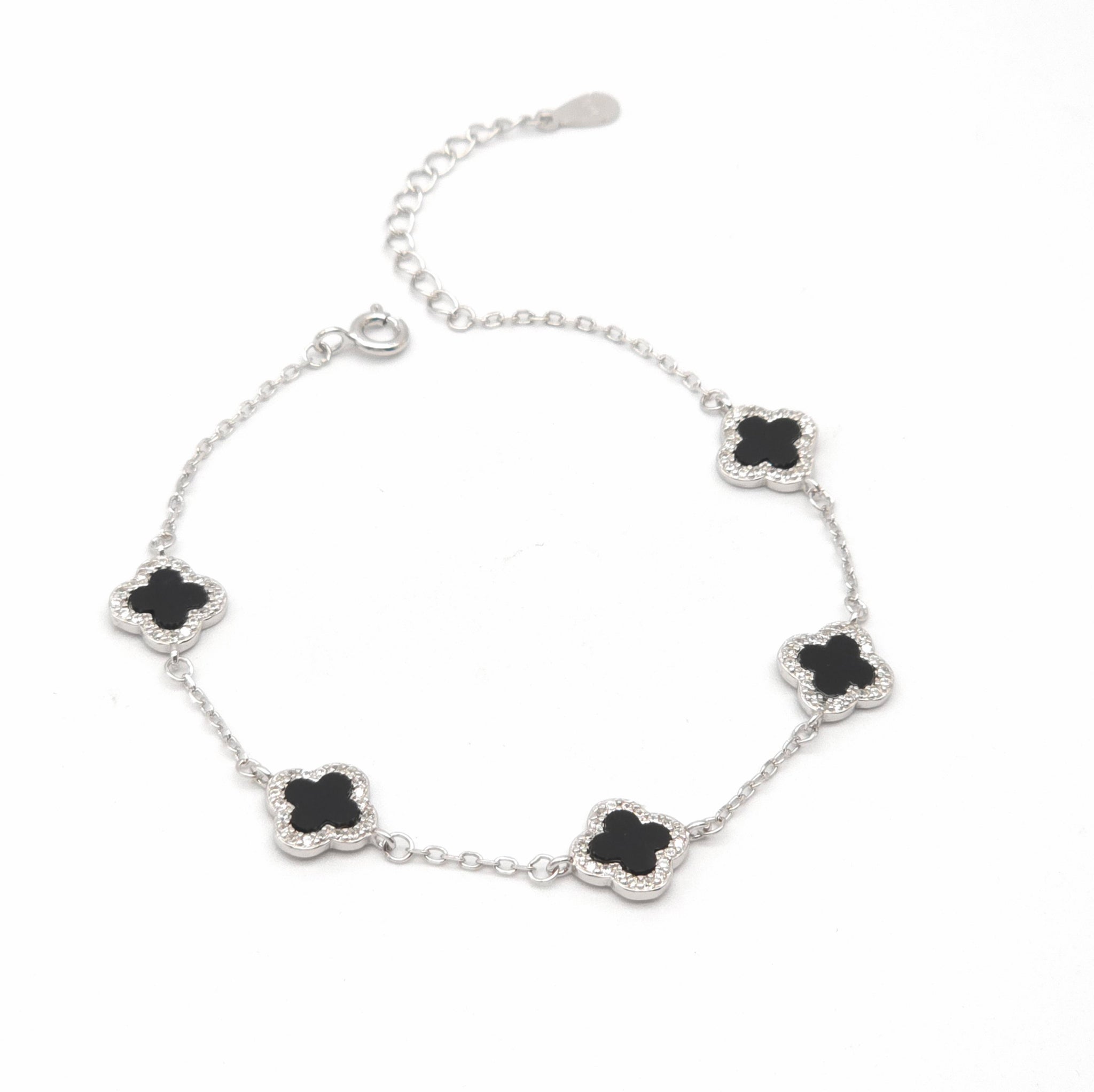 Elevate your accessory game with our 5 Clover Agate Cz Bracelet. Crafted from sterling silver, this bracelet features stunning agate and sparkling cubic zirconia stones, arranged in a unique 5 clover design. Perfect for adding a touch of elegance and sophistication to any outfit. 17cm with 3cm extension