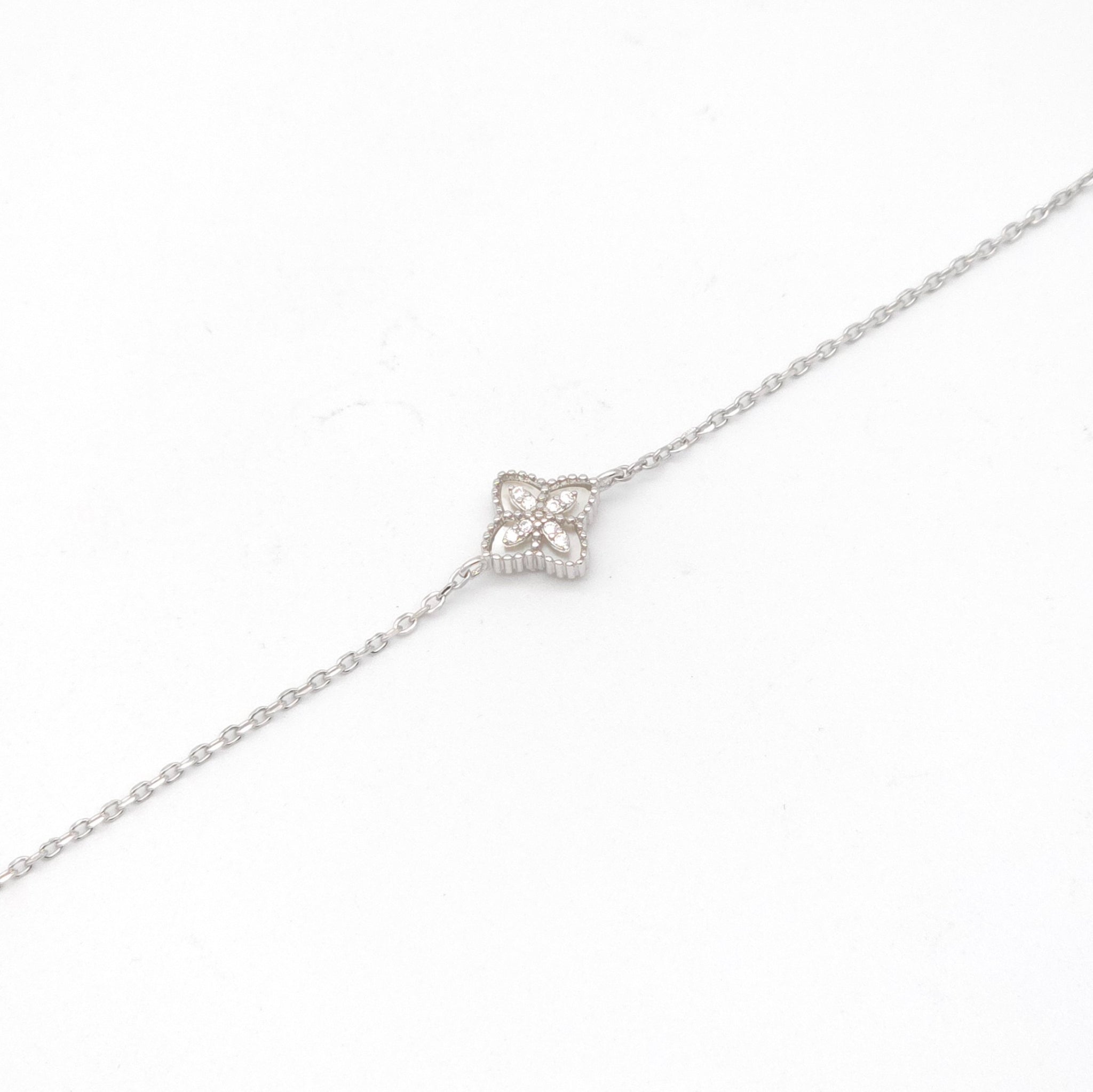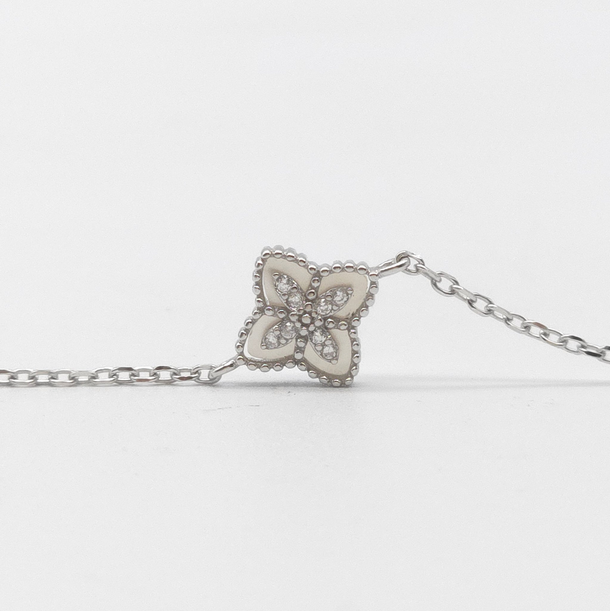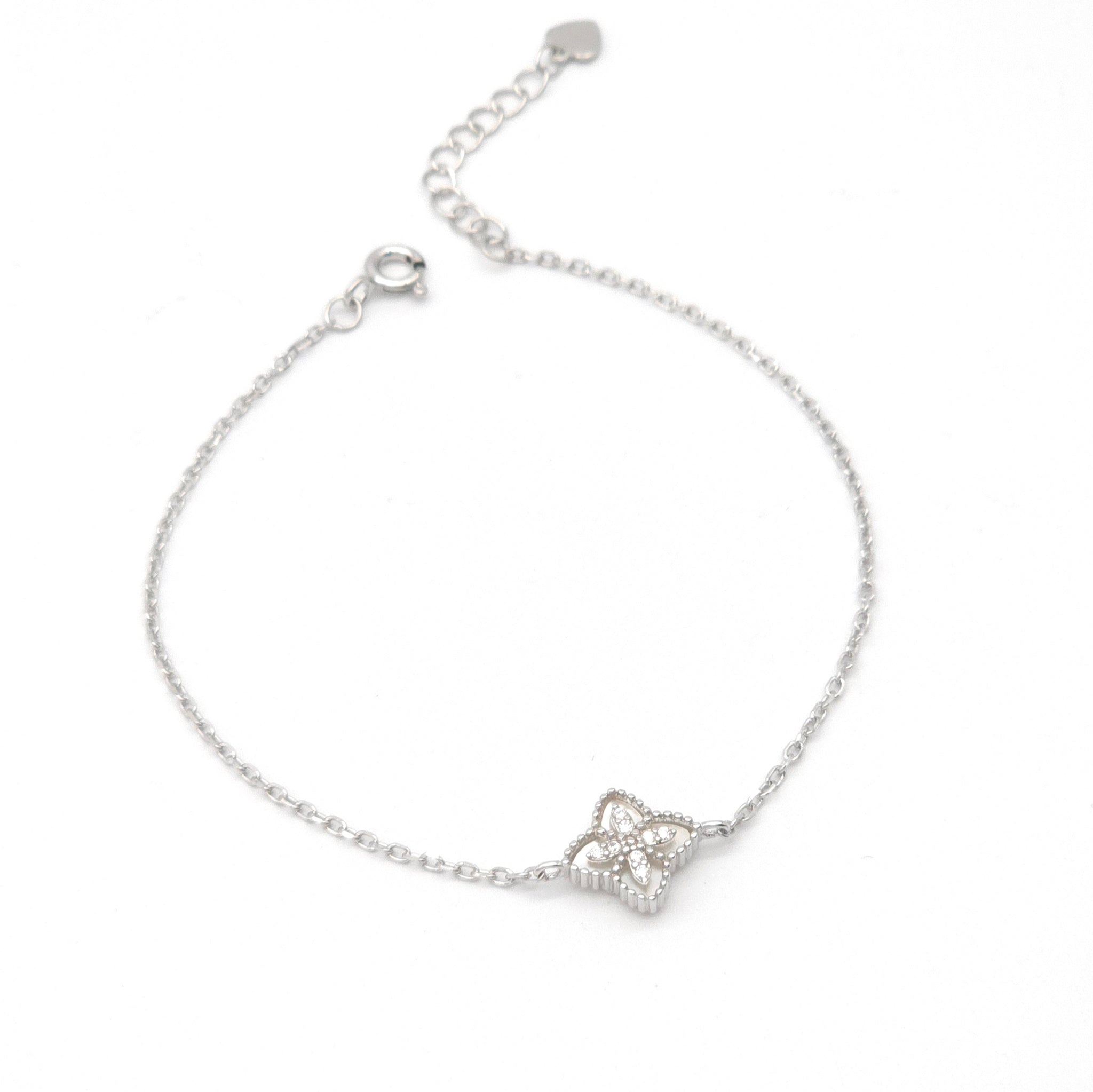 Enhance your style with our Mother of Pearl Floral Bracelet, made with a sterling silver 16.5cm chain and 3cm extension. The bracelet features a beautiful Mother of Pearl shell encrusted with sparkling cubic zirconia, adding a touch of elegance to any outfit. Perfect for any occasion.
