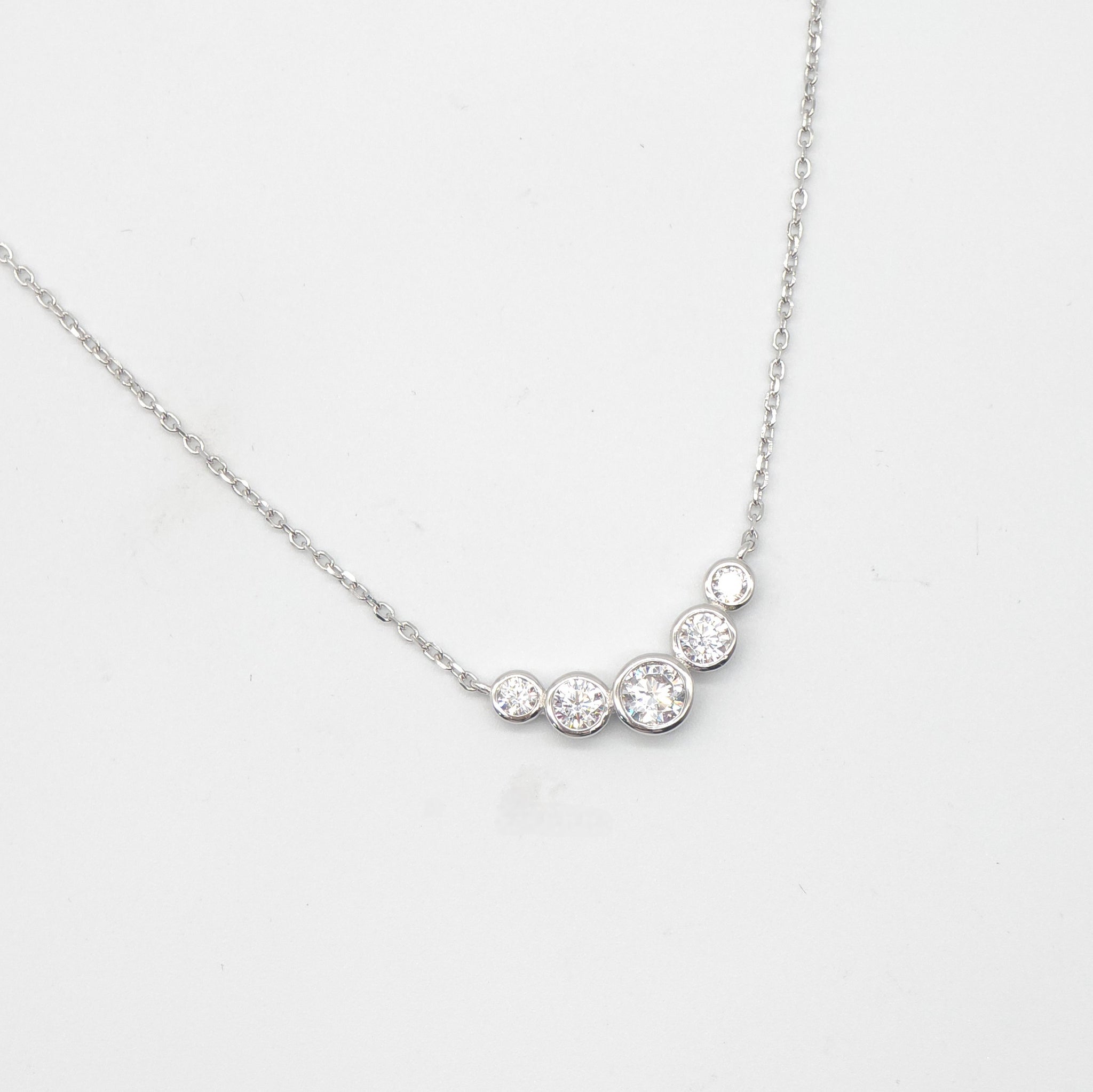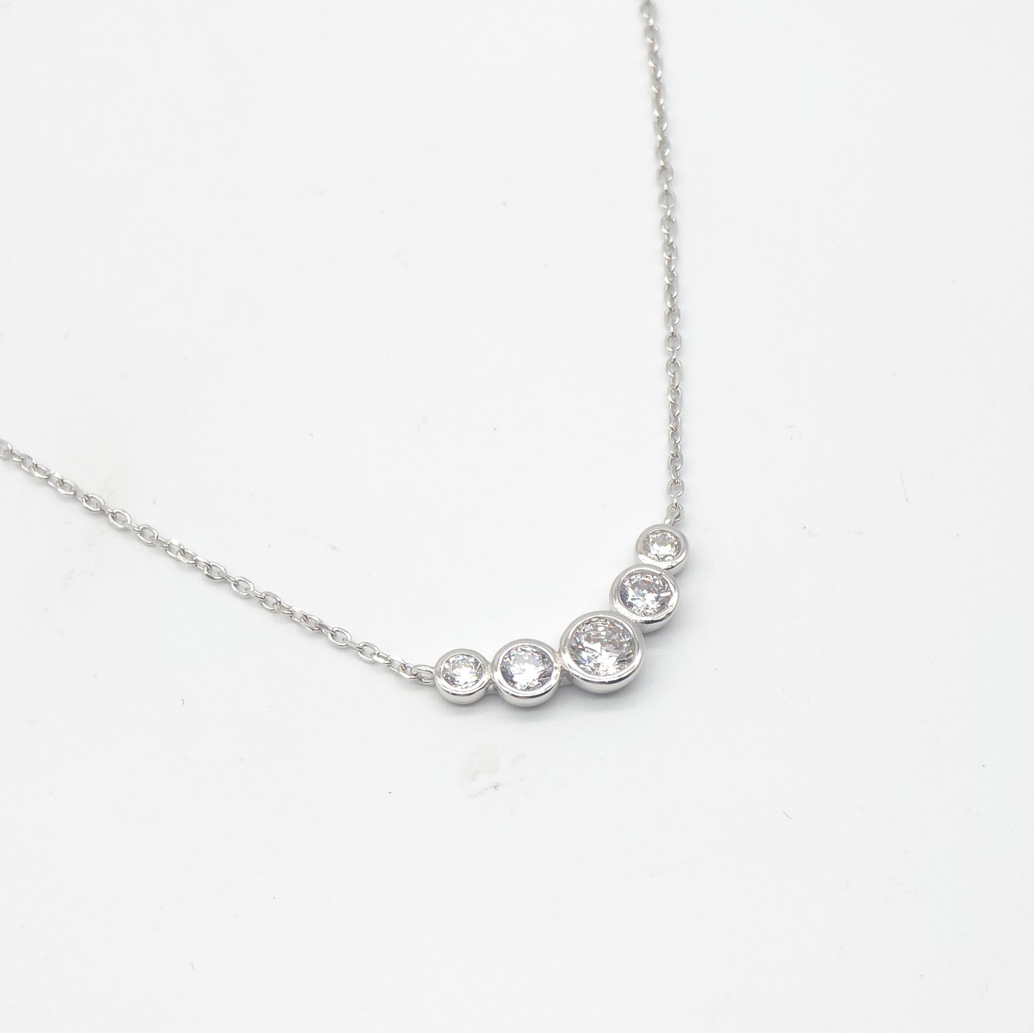 Introducing our 5 Cubic Zirconia Necklace, crafted in sterling silver with 5 sparkling cubic zirconias set in bezel settings. With a 42cm length and 3cm extension, this elegant necklace is perfect for adding a touch of shine to any outfit. Elevate your jewelry collection with our stunning design.