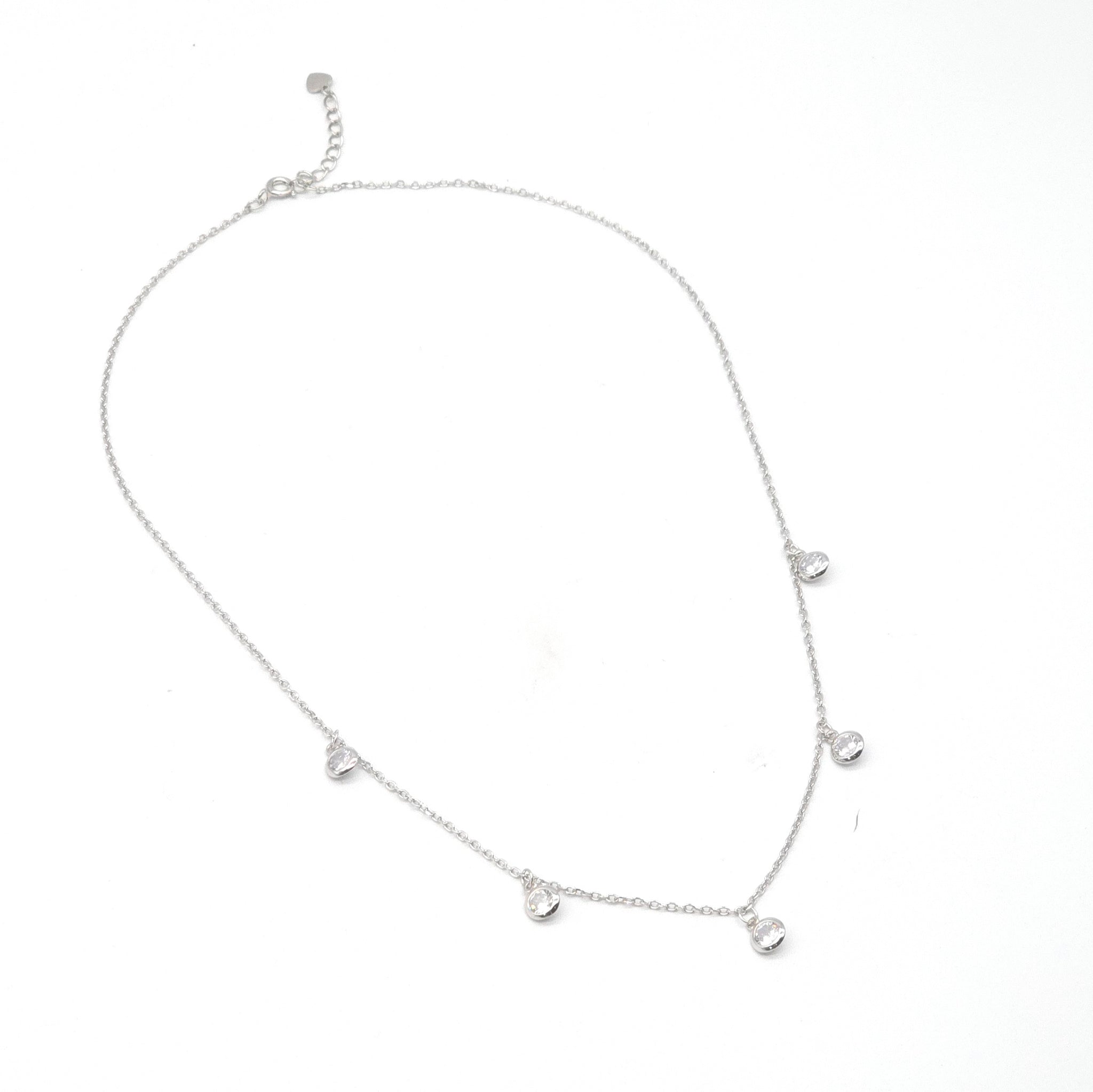Experience timeless elegance with our Cubic Zirconia Charm Necklace. The sterling silver chain measures 42cm, with 5 sparkling cubic zirconia charms dangling from it. Each charm is 5mm and can be adjusted with the 3cm extension. Adorn yourself with this exquisite piece today.
