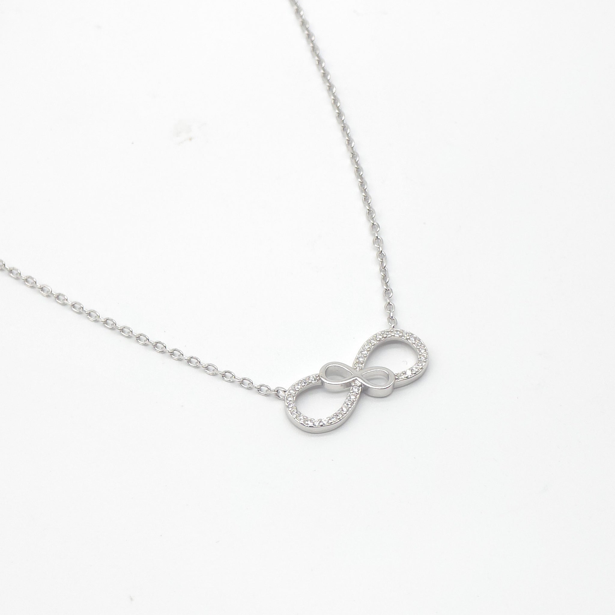 This 42cm Sterling silver double infinity necklace features a small plain infinity inside a cubic zirconia encrusted bigger infinity for a timeless and elegant look. The necklace also has a 3cm extension for adjustable length. Perfect for adding a touch of sophistication to any outfit.