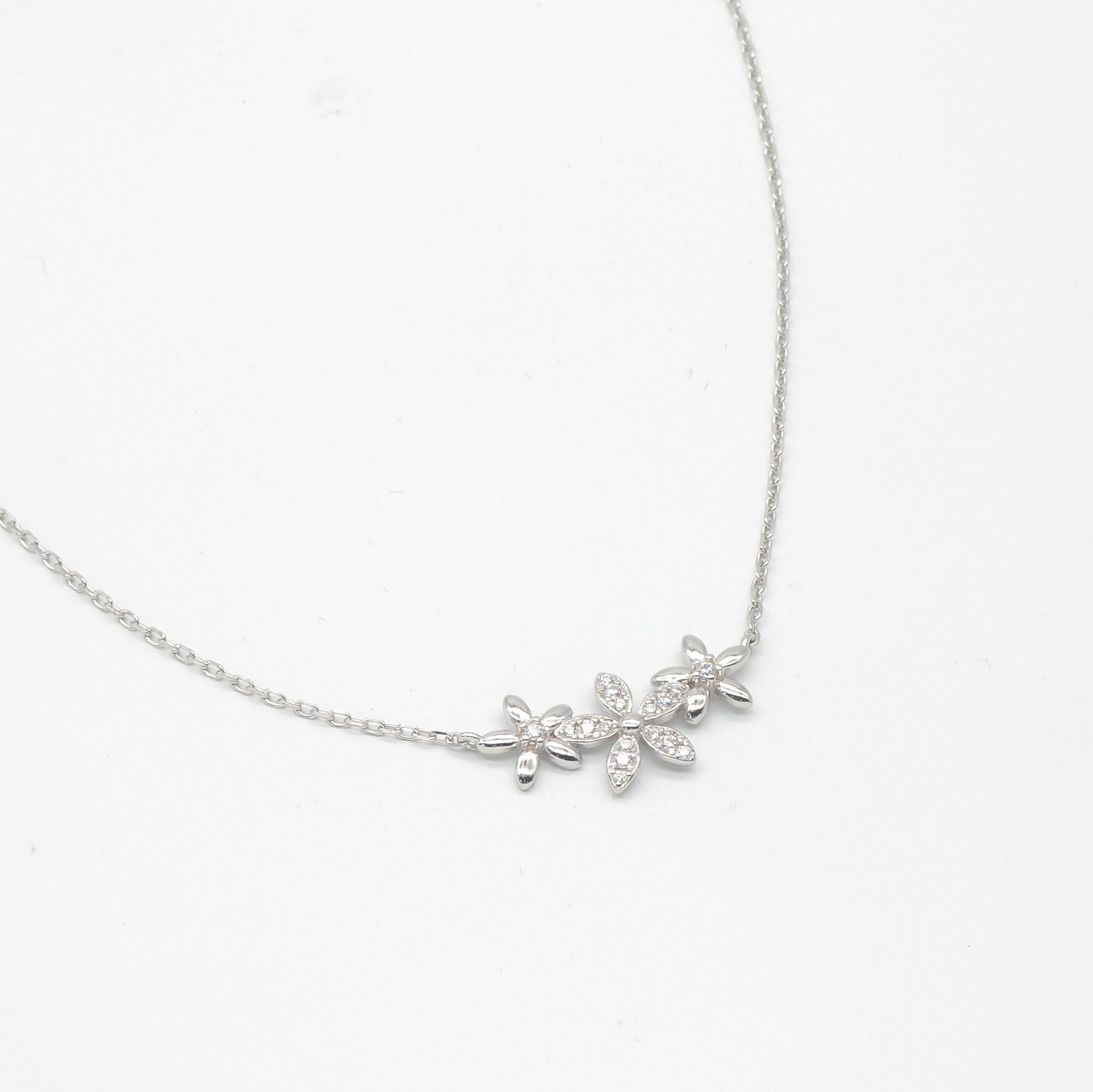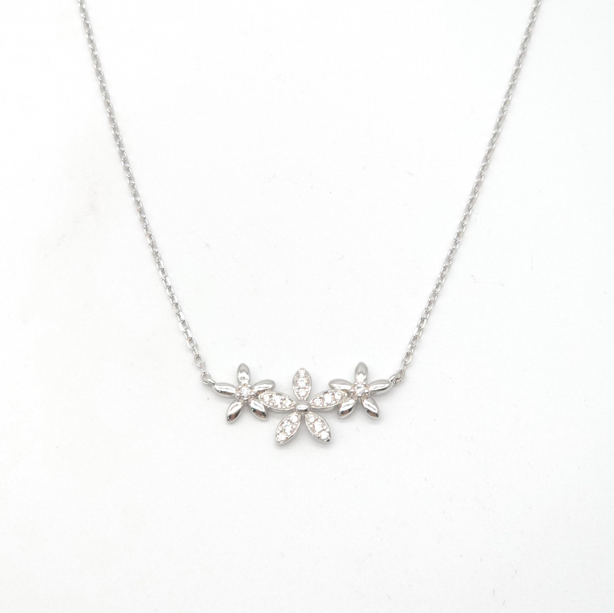 This elegant necklace features three intricately designed sterling silver flowers, each adorned with sparkling cubic zirconias. The 42cm chain includes a 3cm extension, allowing for a customizable fit. Perfect for adding a touch of sophistication to any outfit.